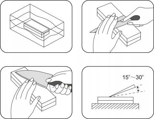 3. Zacznij ostrzenie noża od kamieni o grubszej granulacji, płynnie przechodząc do drobniejszych ostrzałek (400 → 1000; 3000 → 8000). Podczas ostrzenia trzymaj nóż pod kątem 10-20°.
